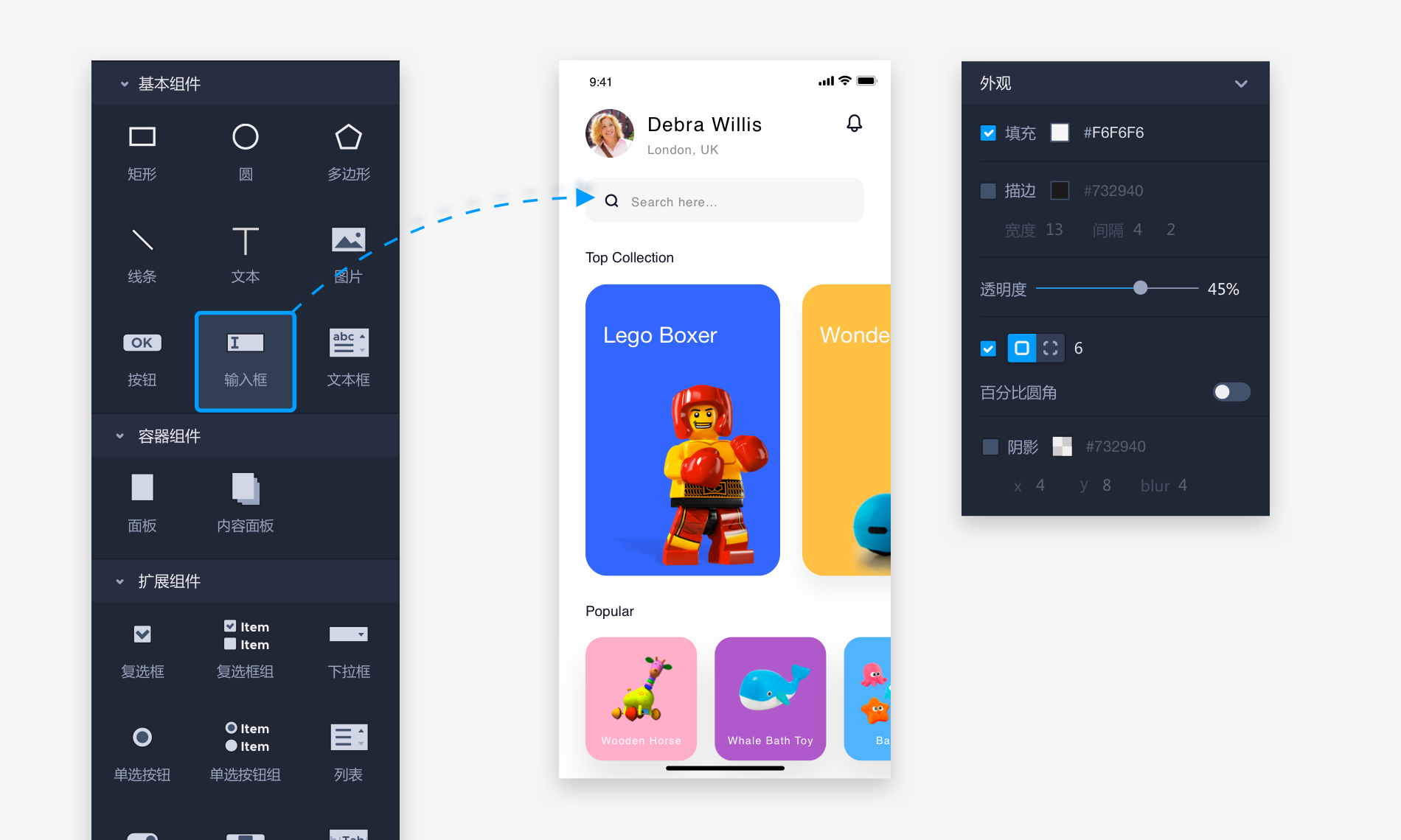 视觉上定位于低保真,但致力于高保真的组件交互能力。表达交互时依然能够准确、完整,并同样简单上手。Mockplus支持基于页面的交互和动画效果。MockplusV2版本,将支持基于组件级别的交互和动画,可即时观察交互效果,大大降低学习成本(国内独有,国外同类产品独有)。